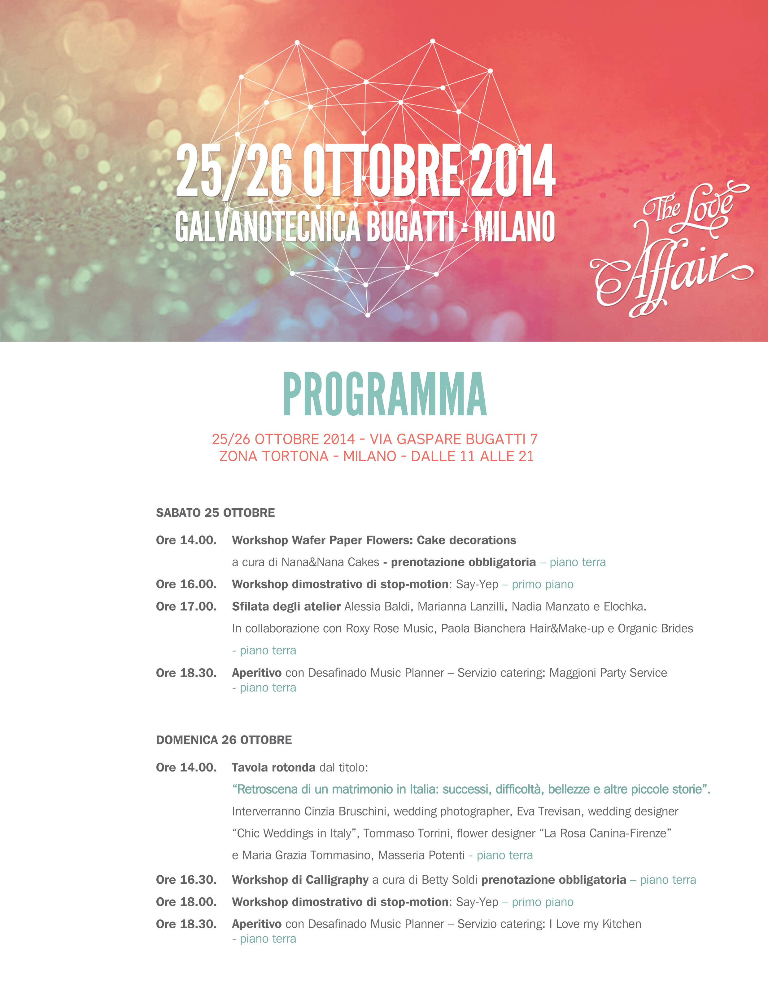 The Love Affair aprirà le porte sabato 25 ottobre dalle 11 alle 21 e domenica 26 sempre dalle 11 alle 21. Oltre ai vari stand si potrà partecipare a diversi workshop a tema, a un incontro sui retroscena dei matrimoni, a una sfilata e anche a un aperitivo che chiuderà le due giornate, di seguito il programma dettagliato: