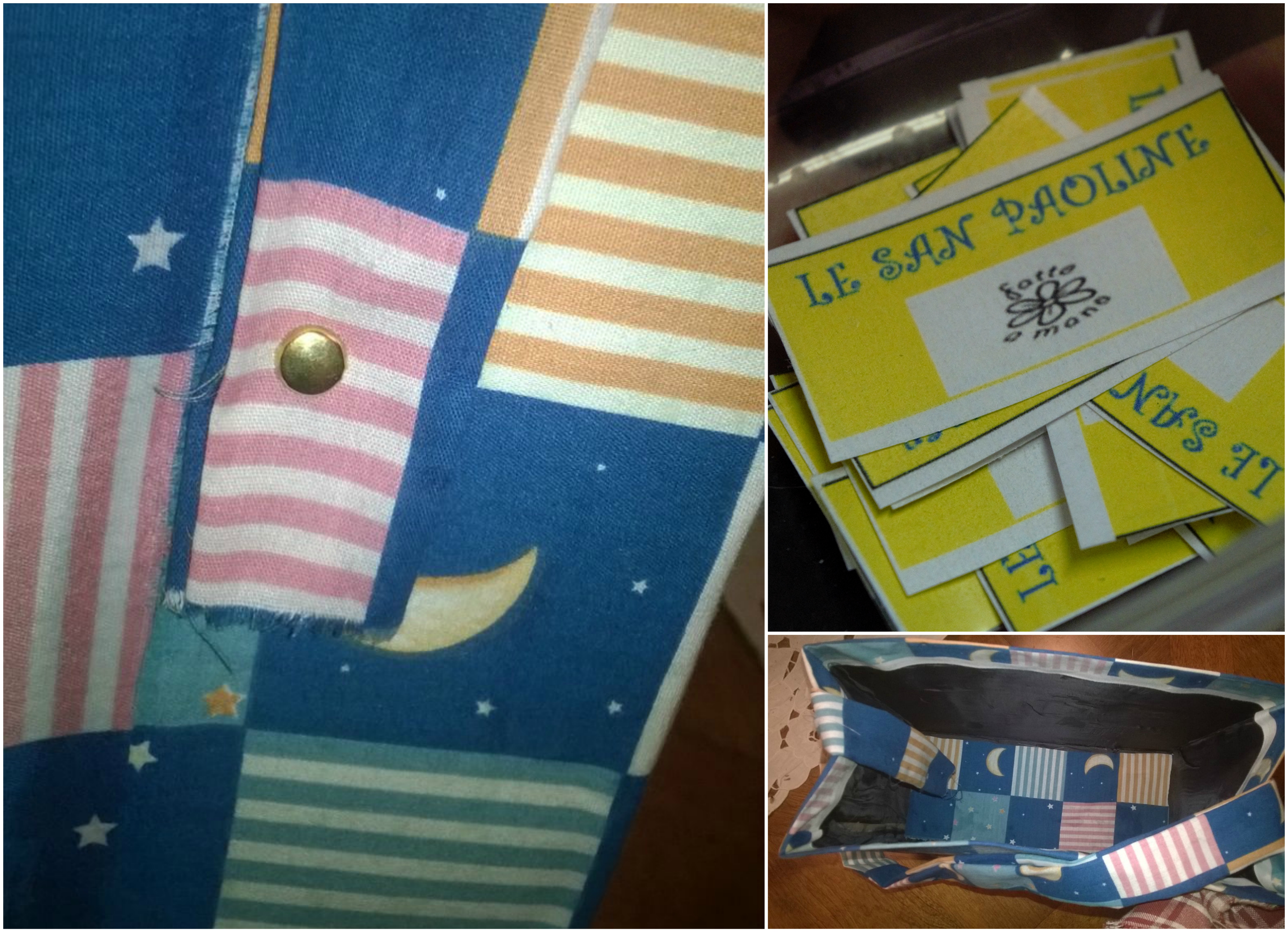 Per concludere potete incollare un’etichetta personalizzata stampata al computer su della semplice carta (ma anche scritta a mano), e dopo plastificata, nel caso aveste la pastificatrice in casa, (nella foto in alto: “le San Paoline”). Basterà incollare anch’essa con la vinavil all’interno della borsa.