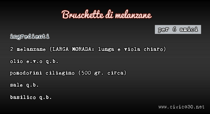 Pranzo o cena con amici in vista e non sapete cosa preparare come aperitivo o antipasto? Perché non sostituire le solite, ma buonissime, bruschette di pane con qualcosa di più fresco e leggero? Oggi vi propongo un’idea davvero sfiziosa e super semplice ^_^ Le bruschette di melanzane!