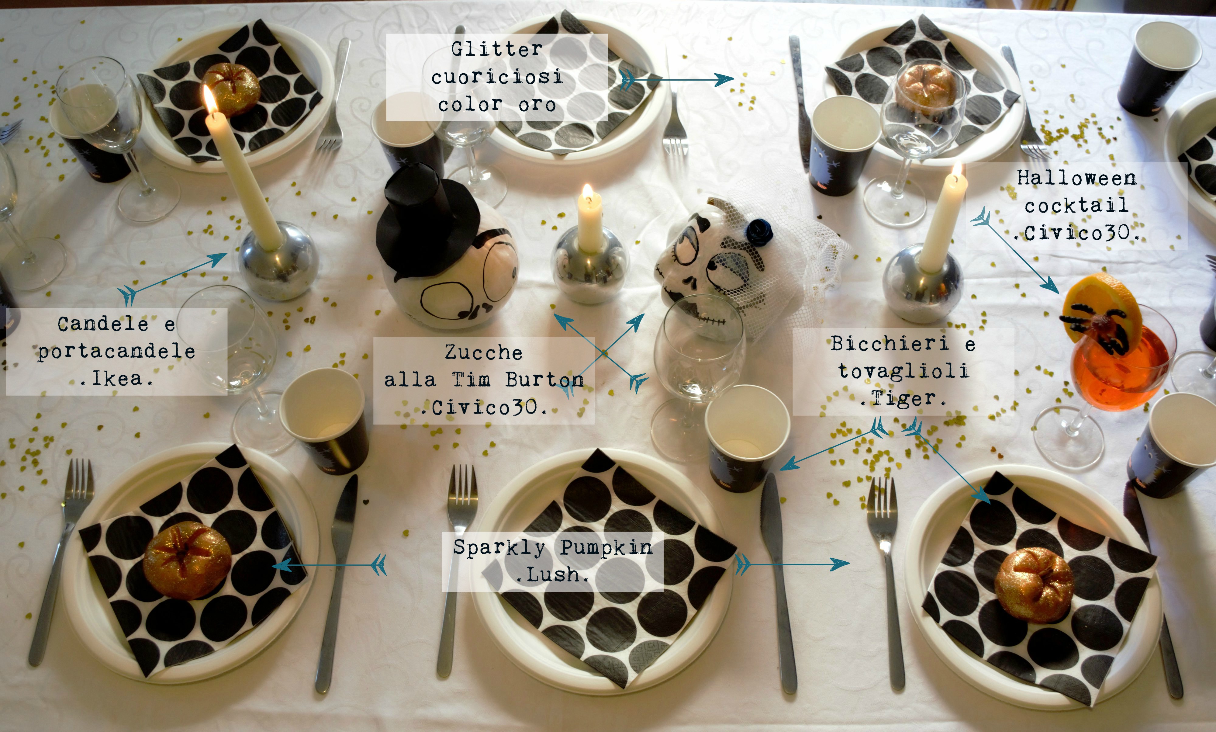 Per dare luce e brio alla tavola ho sparso tanti glitter dorati a forma di cuore sulla tovaglia, e devo dire che mi piacciono molto, in fin dei conti come centrotavola ci sono le nostre zucche innamorate alla Tim Burton, che ho chiamato Tim & Molly, sì anche ad Halloween ci si può innamorare, “sapevatelo”!